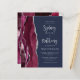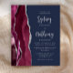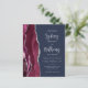 A borda esquerda deste elegante convite de casamento moderno apresenta uma cor d'água borrifada com borda cortada com cintilação falsa de prata. O texto personalizável combina um script de caligrafia de cinza prateada e sans serif num fundo azul marinho. O lado inverso apresenta um design de burgundy e agate prateado.