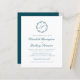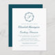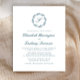Este elegante design de convite de casamento apresenta um monograma de escrita azul teal rodeado por uma coroa botânica de arte de linha. Os nomes aparecem no script teal, com o resto do texto na fonte de serif clássica. A parte traseira da placa é sólida.