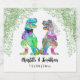 Aprecie seus hóspedes com esta alegria e colorida noiva de dinossauros e o tema do dinossauro do noivo. Tiranossauro Rex dino noiva e noiva coloridas divertidas Tyrannosaurus Rex dino em matizes cor-de-rosa verde-amarelas e folhagem verde da selva, com nomes fáceis de personalizar noivas e noivos e a data do casamento em um moderno roteiro tipográfico caprichoso. Trabalho de arte único original de dino pela artista Catherine Sweetman