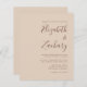 Este simples convite de casamento moderno apresenta um texto marrom num fundo de tom de terra bege neutro. Adicione os nomes da noiva e do noivo na caligrafia de escrita manual do na moda e os detalhes na fonte sans serif. O lado inverso é uma sombra correspondente de bege sólido.