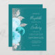 O canto esquerdo deste elegante convite para casamento moderno apresenta um buquê floral em tons de turquesa e azul claro, aparado com folha de falso prateado e folhagem falsa e aspergido com brilho de prata. O texto personalizável combina o script de escrita manual de cinzas de prata pálida, fontes copperplate e itálico em um fundo de turquesa. Adicione mais detalhes no verso, juntamente com um código QR para ajudar seus convidados a visitar seu site de casamento.