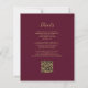 A borda esquerda deste elegante convite de casamento moderno apresenta uma esmeralda verde aquarela agate borda com falsa brilho dourado. O texto personalizável combina manuscritos dourados, copperplate e fontes itálicas em um fundo vermelho arrojado. O verso oferece espaço para detalhes do casamento, juntamente com um código QR que os convidados podem digitalizar para visitar seu site e RSVP, o que economiza o custo de impressão e envio de cartões RSVP separados.