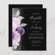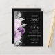 O canto esquerdo deste elegante convite para casamento moderno apresenta um buquê floral em tons de roxo e lavanda, aparado com folha de falso prateado e folhagem falsa e aspergido com brilho de prata. O texto personalizável combina o script de escrita manual de cinzas prateadas pálidas, fontes em copperplate e itálico em um fundo preto. Adicione mais detalhes no verso, juntamente com um código QR para ajudar seus convidados a visitar seu site de casamento.