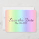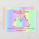 Duas noivas estão de mãos dadas com este cartão de pré-convite para a data para um casamento lésbico. Seu aspecto, e o fundo, é o arco-íris do Orgulho gay em tons pastéis. Alerte sua família e amigos que eles podem limpar seu calendário para seu grande dia.