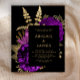 Este elegante e modesto convite de casamento apresenta um buquê floral romântico e exuberante em roxo com folha de ouro e folhagem brilhante num fundo negro. Personalize o texto dourado em fontes na moda em um retângulo preto. A parte traseira da placa é preta e sólida.