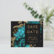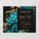 Este elegante e melancólico casamento "Salve o cartão da data" apresenta um buquê floral romântico e luxuoso em turquesa com folha de ouro e folhagem brilhante num fundo negro. Personalize o texto dourado em fontes na moda em um retângulo preto e adicione o URL do seu site de casamento ao preto sólido.