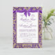 Convite de casamento para cores damasco elegantes e roxas com design de arco impresso e texto de tipografia moderna.