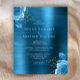 Este glamouroso convite para o casamento floral apresenta buquês florais azuis claros e lacrimejantes saltados com folhagem de folha de ouro em dois cantos. Os nomes do casal aparecem em caracteres clássicos de serif branca, com o texto restante em itálico, em um fundo de metal esfregado azul-lacrimejante.
