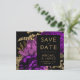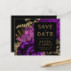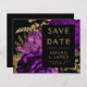 Este elegante e melancólico casamento Salve o cartão de Data apresenta um buquê floral romântico e luxuoso em roxo com folha de ouro e folhagem brilhante num fundo negro. Personalize o texto dourado em fontes estilosas em um retângulo preto e adicione o URL do site de casamento ao preto sólido.