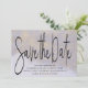 Salvar a data é escrita em uma bela caligrafia. Ele enquadra seus nomes, data de casamento e local - que são escritos em uma fonte simples e moderna. Uma lavagem de aquarela púrpura e macia embelezada com brilho púrpura cria um fundo sofisticado. A maneira perfeita de deixar os convidados saberem o seu casamento.