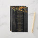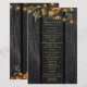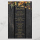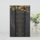 Modelo de menu de recepção de casamento com características rústicas queimadas, laranja enferrujado e botânicos de outono verdes em um fundo de madeira de celeiro marrom escuro com luzes de corda. Ideal para o seu casamento rústico elegante country ao ar livre no jardício ou na fazenda no outono.