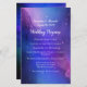 Linda nebulosa roxa e azul no espaço pintado com trabalho de arte de aquarela de tinta com estrelas noturnas num céu noturno cristalino. Perfeito para uma cerimônia religiosa espiritual ou moderna e para uma celebração. A nebulosa na moda arco-íris contrasta com as constelações geométricas e com a galáxia espacial externa. Excelente para o fã de astronomia que ama a lua e o universo cósmico estrelado.