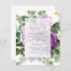Um elegante buquê de aquarela de rosas roxas cercadas por folhas verdes de eucalipto e folhagem dourada fornece o fundo para o texto da cinza de carvão em uma tela retangular branca.
