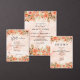 Lindas flores cor-de-laranja e folhas elegantes com seus detalhes da cerimônia de casamento em letras quentes na frente e seus detalhes de casamento estão na parte de trás disso tudo em um convite. CORRESPONDENDO a itens na nossa loja.
