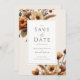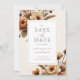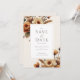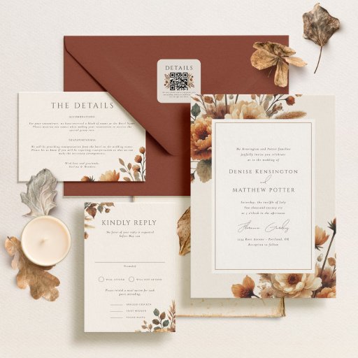 O convite apresenta um esquema sofisticado com um fundo de creme suave. Nas bordas superior e inferior, delicadas flores aquáticas em tons quentes de laranja, creme e castanho mudado enquadram o texto, adicionando um toque natural e orgânico ao design. O arranjo floral está disposto de forma artística para criar um aspecto equilibrado e harmonioso, melhorando a refinada estética do convite. A área central do texto é delimitada por uma estrutura fina e dourada, que dá à design um toque de luxo sem sobrecarregar a simplicidade da disposição geral. O texto é definido em uma fonte serif clássica, oferecendo um eterno e um apelo gracioso, perfeito para um evento formal. A combinação da delicada paleta de cores e da elegante tipografia faz desse convite uma escolha ideal para casamentos com um tema romântico, inspirado no outono. Essa design é perfeita para casais que buscam incorporar a beleza da temporada de outono à sua papelaria de casamento enquanto mantêm uma apresentação polida e sofisticada.