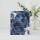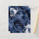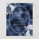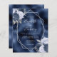 Este elegante convite de casamento moderno apresenta um quadro geométrico prateado decorado com buquês florais azuis, marinhos e prateados empoeirados num fundo de folha azul marinho. O texto personalizável combina a escrita manual imétrica de cinzas prateadas, a placa de cobre e as fontes itálicas.