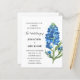 Bluebonnets Texas Flowers Watercolor Invitation - Elegante Floral Design Celebra seu dia especial com a beleza eterno da natureza no nosso Convite para Casamento por Aquarela das Flores Bluebonnets. Este design espetacular apresenta flores de bluebonnet, delicadas, pintadas à mão, capturando a essência do primavera e romance. As matizes moles e os florais graciosos criam um convite elegante e sofisticado que vai dar o tom perfeito para o seu dia de casamento. Ideal para casais que buscam um toque natural e inspirado na safra, este convite traz um encanto refrescante, mas clássico, para sua celebração. Personalize-o com seus detalhes de casamento e torne-o exclusivamente seu. Impresso em papel de qualidade, este Convite para Casamento Bluebonnet é uma bela maneira de convidar seus convidados a compartilhar a alegria de sua história de amor. Principais recursos: Flores de bluebonnet de cor d'água macia em uma paleta romântica elegante e personalizável design para se adequar ao seu tema de casamento Disponível em uma variedade de opções de papel premium Perfeito para casamentos de primavera e ao ar livre, comemorações de jardim e eventos de chic rústicos Adicione um toque de elegância floral ao seu casamento com este requintado convite para casamentos de flores de cor d'água!