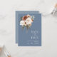 Rustic Dusty Blue Peach Casamento Floral Salve o Cartão de Data. Convide seus convidados para o dia do seu casamento com este cartão elegantemente desenhado para salvar a data do casamento com uma bela mistura de flores azuis, pêssego e verde-oliva. Este cartão salva-vidas tem um belo design floral e botânico, com vibrações rústicas e boho, perfeito para o seu casamento floral ou inspirado em flor silvestre. A disposição mínima e simples chama a atenção para o magro verde e os elementos florais elegantes. Este cartão de salvamento irá dar o tom para um belo cenário de casamento rodeado de verde e flores silvestres. Uma adição perfeita a qualquer celebração botânica ou boho-chic.