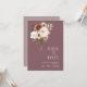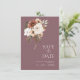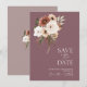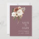 Roxo Rústico com Flores de Pêssego Salve o Cartão de Data. Convide seus convidados para o dia do seu casamento com este convite elegantemente desenhado para salvar a data do casamento apresentando uma bela mistura de pêssego e flores verdes de azeitona em um lindo fundo roxo. Este cartão salva-vidas do casamento tem um belo design floral e botânico, com vibrações rústicas e boho, perfeito para o seu casamento floral ou boho-chic. A disposição mínima e moderna chama a atenção para o pêssego esmagador, disposições florais elegantes estabelecidas sobre um fundo roxo impressionante. Este cartão de salvamento do casamento vai dar o tom para um belo cenário de casamento rodeado por lilás, ou decoração de casamento roxa e flores de pêssego e creme. Uma adição perfeita a qualquer celebração botânica ou rústica.