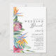 Este convite de brunch floral tropical colorido é perfeito para o seu destino de boho moderno, verde, roxo, almoço de pêssego. Design apresenta um buquê elegante de verde-aquarela de praia clássico e flores, incluindo eucalipto verde-sábio, mauve e proteína vermelha, hibisco rosa-pincel, pássaro-laranja e azul do paraíso e folha de palma verde-escura. O design é ideal para um simples, criativo, único casamento de viagem para primavera, verão, outono ou inverno! Por favor, encontre outra papelaria de casamento no resto da coleção.