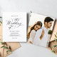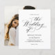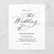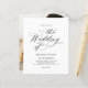 Este convite para o casamento apresenta uma design elegante e minimalista, com a caligrafia negra clássica e fontes serif em fundo branco.