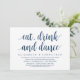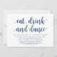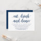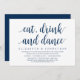 Roteiro Moderno em tema Azul Marinho Clássico, cartão de convite de casamento fuga (Coma, Beba e Dança). É perfeito para o seu jantar de casamento fuga casual à beira do lago, dança e festa.