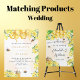 Um cardápio de casamento para um casamento no verão. Abelhas bonitas, florais amarelos e mel pingando de favos. Personalize e adicione seus nomes, data e menu de casamento. A palavra Menu é escrita com um script de estilo alfanumérico com letra de tendência com alternâncias.