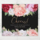 Belos rosas brancos, cor-de-rosa, vermelhos e arrojados em fundo preto. Fontes elegantes. Monograma da noiva e do noivo nas costas, numa coroa festiva de rosa, parecida com o buquê do casamento. Bold, contraste, design de casamento preto moderno. A trabalho de arte é baseada em impressões de pintura fina de Pierre-Joseph Redouté e Henry Joseph Redouté.