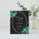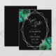 Este elegante casamento moderno salva o cartão de data apresenta uma imagem geométrica prateada decorada com buquês florais esmeraldas e prateadas em fundo preto. O texto personalizável combina a escrita manual imétrica de cinzas prateadas, a placa de cobre e as fontes itálicas. O reverso é preto sólido.
