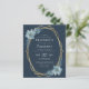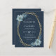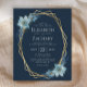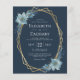 Este design de convite para o casamento apresenta um quadro geométrico dourado, decorado com poinsetos polinizadores azuis empoeirados e verde de inverno, ao redor do texto branco sobre fundo azul marinho. A parte traseira da placa é azul marinho estável.