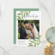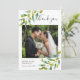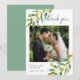 cartão de agradecimento de foto de casamento no jardim com delicada folhagem verde em aquarela, emoldurando sua foto de casamento com os detalhes de agradecimento em letras elegantes em cinza ardósia.