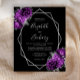 Este elegante convite de casamento moderno apresenta um quadro geométrico de prata decorado com flores roxas e prateadas em fundo preto. O texto personalizável combina a escrita manual imétrica de cinzas prateadas, a placa de cobre e as fontes itálicas. O reverso é preto sólido.