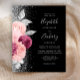 A borda esquerda deste elegante convite de casamento moderno apresenta um buquê floral em tons de burgundy e rosa-pincel, aparados com folha de falso prateado e folhagem de falso brilho e borrifados com brilho de prata. O texto personalizável combina o script de escrita manual de cinzas prateadas, fontes copperplate e itálico em um fundo preto. O verso apresenta uma lata de burro, uma pinca e um design floral prateado.