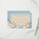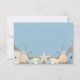 Um belo cartão de resposta RSVP de destino com um tema exótico de praia. Um padrão bonito de fundo de textura de areia em tons natas neutros e tons de azul-oceano está espalhado com muitos pedacinhos de praia. Por cima dos seixos estão várias conchas marinhas, ouriços-do-mar, estrelas-do-mar e pérolas.