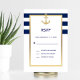 Cartões de casamento náuticos de RSVP personalizados elegantes. Listras azuis e brancas marinhos com falso quadro e âncora dourado. Perfeito qualquer tema de casamento náutico/verão. Cartões editáveis - fácil adicionar suas informações ou alterar a fonte, cor e tamanho do texto.