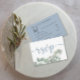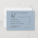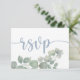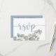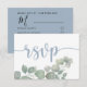 Cartão rsvp de casamento simples e moderno com tipografia elegante em azul empoeirado sobre fundo branco, com adição de folhagem de aquarela de eucalipto. Personalize com facilidade.