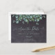 Salve A Data! Anuncie o seu casamento a amigos e familiares com este quadro rústico e cartões salve a data de eucalipto. Estes cartões de convite para casamento têm uma opção de envelope. Personalizar com nomes, data do casamento, localização. Adicione qualquer outra informação na parte de trás. Esse casamento único e verde salvando as cartas vai causar uma impressão duradoura, seus hóspedes vão se certificar de salvar a data! COPYRIGHT © 2020 Judy Burrows, Black Dog Art - Todos Os Direitos Reservados. Casamento Rustic Eucalyptus Budget Salvar A Data