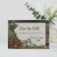 Um convite de casamento com tema rústico florestal, cartão de aviso de data para o homem da montanha e fada da floresta. Este design apresenta um fundo de design de tábua de madeira escura rústica e decorado com galhos de sempre-viva em cedro, abeto e pinhas elegantes. Personalize adicionando o nome da noiva e do noivo, bem como a data do casamento.