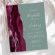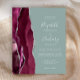 A borda esquerda deste elegante convite de casamento moderno apresenta uma cor d'água borrifada com borda cortada com cintilação falsa de prata. O texto personalizável combina manuscrito branco, fontes em copperplate e itálico em um fundo verde sábio. O lado inverso apresenta um design de burgundy e agate prateado.
