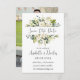 Este design apresenta uma ilustração de rosas brancas com folhagem vibrante colorida no estilo aquarela. O texto "Salvar a data" é escrito em um Script.