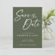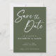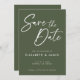 Fundo verde-oliva moderno com estilo branco de escrita manual Salve o cartão de convite de Data. Este design apresenta uma fonte de estilo de caligrafia grande que você pode mudar sua cor de branco para qualquer outra cor que quiser. Você também pode personalizar todos os detalhes e cores neste design Salvar a Data.
