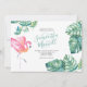 Este convite para o verão apresenta os seus nomes em uma tipografia de script manuscrita na moda com detalhes de eventos em uma seringa de cinza de carvão clássico em um fundo branco nítido com uma carapaça da minha coloração d'água original rosa flamingo e folhas de palma monstera em tons de blues, verdes e turquesa. A carta de convite reverte para uma cor verde-azul-turquesa tropical complementar. Uma escolha botânica, mas elegante, para praia casual, Florida Keys, Caribe e casamentos costeiros. Para ver convites de casamento mais bonitos por Victoria Grigaliunas visite DotellABelle no Zazzle.