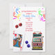 O casino tematizou o convite de festa de solteira feito em branco com gráficos de uma Rainha de Corações, dados, confetti e uma máquina de caça. Personalize o texto de acordo com as necessidades do seu partido.