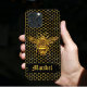 Design apresenta uma abelha rainha de ouro espumante desenhada à mão sobre uma colmeia hexágona de ouro. Personalizado com a elegante tipografia do dourado; fazer-o como um acessório único e elegante de ouro preto. Direitos autorais de Suki, todos os direitos reservados.