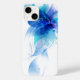 Este caso do iPhone 14 é mostrado em uma cor branca com um impressão de flor tropical azul. Personalize este item ou comprar como está. Imagem do stock