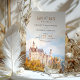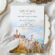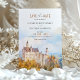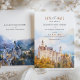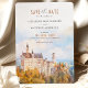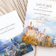 Anuncie seu casamento em estilo encantador com este cartão "Salvar a Data", com uma ilustração impressionante de cor d'água do icônico Castelo Neuschwanstein na Baviera, Alemanha. A trabalho de arte capta a essência de conto de fadas deste castelo romântico, aninhado entre árvores de outono e montanhas azuis negras. Com tons suaves de âmbar, sábio e azul-nebuloso, este cartão é perfeito para casais planejando um casamento de destino fantástico. Que o charme e a grandiosidade da paisagem bávara deem o tom para o seu dia especial com este elegante e eterno.