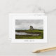 Cartão postal do castelo medieval Dunguaire sob um céu cinza em Kinvara, condado Galway, na Irlanda, com uma fronteira branca e o texto "Irlanda".