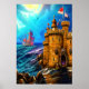 Um pequeno castelo no oceano com um navio navegando no mar. Esta é uma arte gerada por IA.