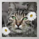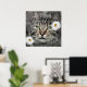 Este belo impressão de poster para amantes de gatos e donos de gatos mostra uma fotografia de um lindo gato pelado com olhares verdes e nariz marrom agudo e bonito escondido na grama enquanto ele olha especulativamente para uma árvore com pássaros nela. Em ambos os lados do rosto do gato tom estão flores margaridas.