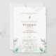 Elegante cristão, convite de casamento de fé católica com campos de texto modelo para ambos os lados para que você inclua cerimônia de casamento, recepção, rsvp, ordem resumida do programa do dia. Folha botânica verde, tema foliar com alface dourada e cruz.